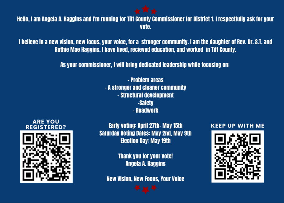 Hello, I am Angela A. Haggins and I'm running for Tift County Commissioner for District 1. I respectfully ask for your vote.